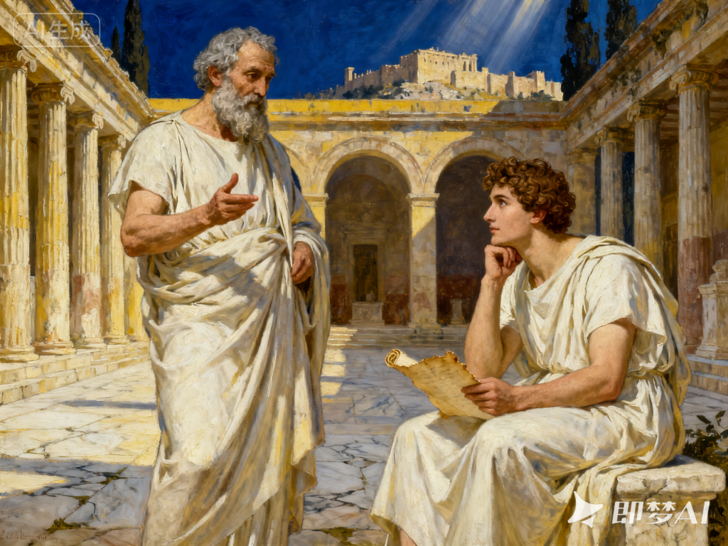 生成时参考文艺复兴时期大师的技法,古希腊雅典学院的庭院中,苏格拉底站在画面左侧,他是一位约60岁的希腊男性,有着浓密的灰白色胡须,额头饱满,眼神深邃而温和,穿着简朴的白色长袍,右手做出手势正在阐述哲学观点。柏拉图坐在右侧的石凳上,他是一位约25岁的年轻希腊男性,有着卷曲的棕色头发,面容英俊,穿着优雅的白色长袍,左手托腮,右手拿着羊皮纸卷轴,神情专注地凝视着老师,眼中充满求知欲。传递知识与价值,传承文明,引导个体成长,为学生埋下思想的种子,正是教师的责任。