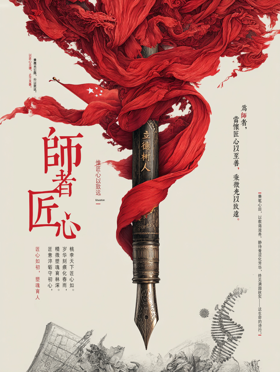 本海报以经典钢笔为核心,红色丝带缠绕着钢笔,灵动地化为飘扬的红旗、厚重的书本、精密的齿轮与蓬勃的DNA链。深刻诠释了教师以笔为耕,将理想信念、知识传承、创新精神与科学追求融于一体,肩负起为党育人、为国育才的光荣使命,彰显了“德艺双馨,铸魂育人”的崇高师德。