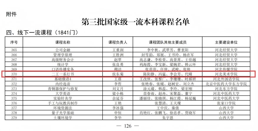 近日,教育部发布《关于公布第三批国家级一流本科课程认定结果的通知》(教高函〔2025〕9号),我校《二王一系行书》成功入选第三批国家级线下一流课程,成为学校在课程建设领域取得的又一重要突破,为学校深化教育教学改革、打造优质课程体系注入强劲动力。