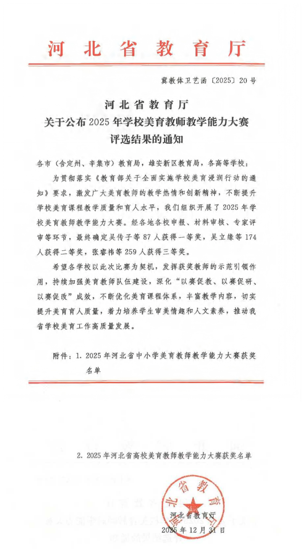 近日,2025年河北省学校美育教师教学能力大赛结果公布。我校选送的孙莉莉、张含星两位教师凭借其富有创新的课程设计,双双荣获三等奖,展现了我校美育教师的扎实功底与探索精神。