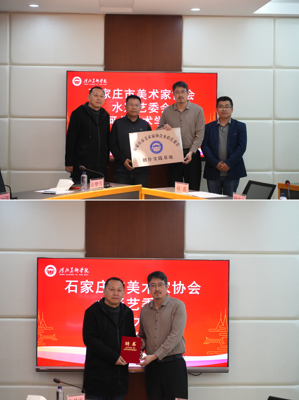 冯建法主席、王杰处长共同为“石家庄市美术家协会水彩艺委会创作实践基地”揭牌,此举标志着创作实践基地正式落地河北美术学院。同时,为水性材料绘画专家颁发特聘证书,进一步夯实了水性材料实验室的师资支撑,为实验室后续各项工作的开展奠定了坚实基础。