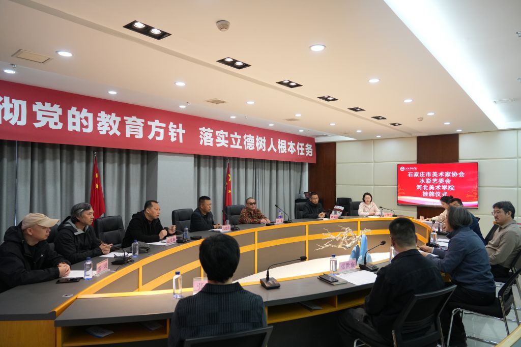 2026年3月25日上午,石家庄市美术家协会水彩艺委会创作实践基地挂牌仪式在河北美术学院1A综合楼318会议室隆重举行。本次活动以教务处产教融合中心水性材料实验室为载体,联合造型艺术学院水彩粉画教研室,共同开展对水性材料艺术创作研究与交流工作,深化专业与行业协同发展的产教融合实践教学体系,推动水性材料艺术创作实践与学生创新高质量发展。