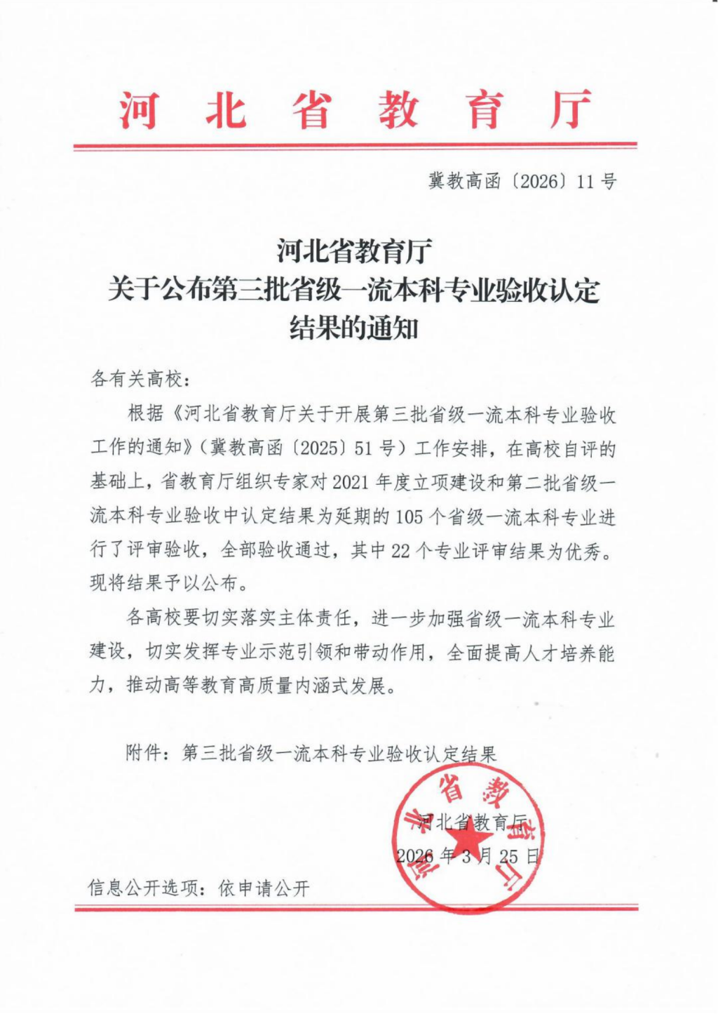 近日,河北省教育厅印发《关于公布第三批省级一流本科专业验收认定结果的通知》(冀教高函〔2026〕11号),公布了2021年度立项建设的认定结果,我校播音与主持艺术专业顺利通过验收认定。至此,学校书法学、环境设计、动画、雕塑、广播电视编导、播音与主持艺术6个专业全部验收认定为省级一流本科专业。